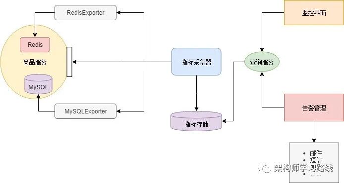 微服务架构中组件繁多,各个组件所需要监控的指标不同。比如Redis缓存一般监控占用内存值、网络流量,数据库监控连接数、磁盘空间,业务服务监控并发数、响应延迟、错误率等。因此如果做一个大而全的监控系统来监控各个组件是不大现实的,而且扩展性会很差。一般的做法是让各个组件提供报告自己当前状态的接口(metrics接口),这个接口输出的数据格式应该是一致的。然后部署一个指标采集器组件,定时从这些接口获取并保持组件状态,同时提供查询服务。最后还需要一个UI,从指标采集器查询各项指标,绘制监控界面或者根据阈值发出告警。