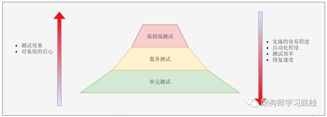 三种测试从上到下实施的容易程度递增,但是测试效果递减。端到端测试最费时费力,但是通过测试后我们对系统最有信心。单元测试最容易实施,效率也最高,但是测试后不能保证整个系统没有问题。