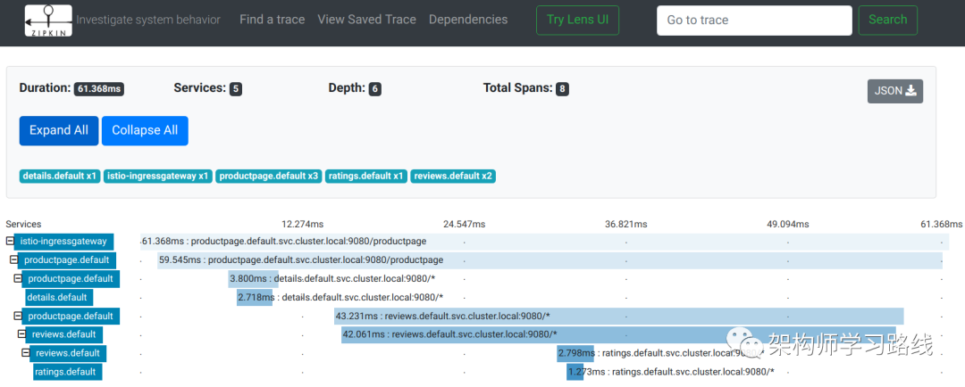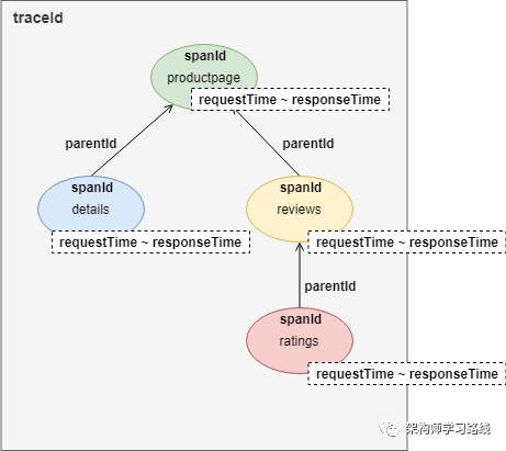 从图中可以看到,这是一个用户访问productpage页面的请求。在请求过程中,productpage服务顺序调用了details和reviews服务的接口。而reviews服务在响应过程中又调用了ratings的接口。整个链路跟踪的记录是一棵树: