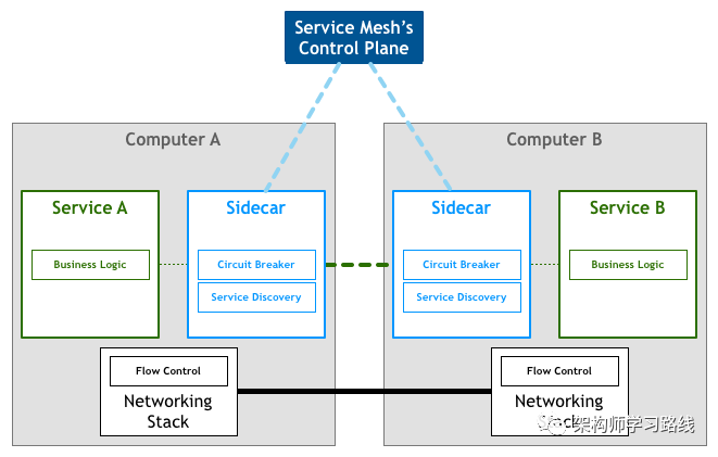 Sidecar只负责网络通信。还需要有个组件来统一管理所有sidecar的配置。在Service Mesh中,负责网络通信的部分叫数据平面(data plane),负责配置管理的部分叫控制平面(control plane)。数据平面和控制平面构成了Service Mesh的基本架构。