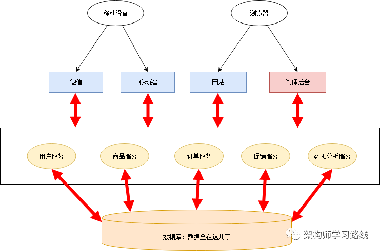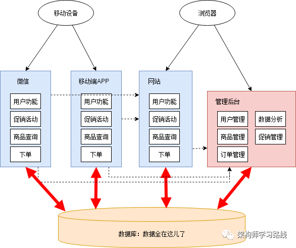 因为开发任务比较紧迫,小明小红没有好好规划整个系统的架构,随便拍了拍脑袋,决定把促销管理和数据分析放在管理后台里,微信和移动端APP另外搭建。通宵了几天后,新功能和新应用基本完工。这时架构图如下:
